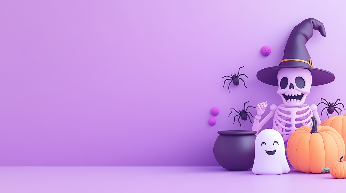 3D-рендер милых мультяшных персонажей Хэллоуина на фиолетовом фоне с пространством для текста и скелетом в минималистском стиле