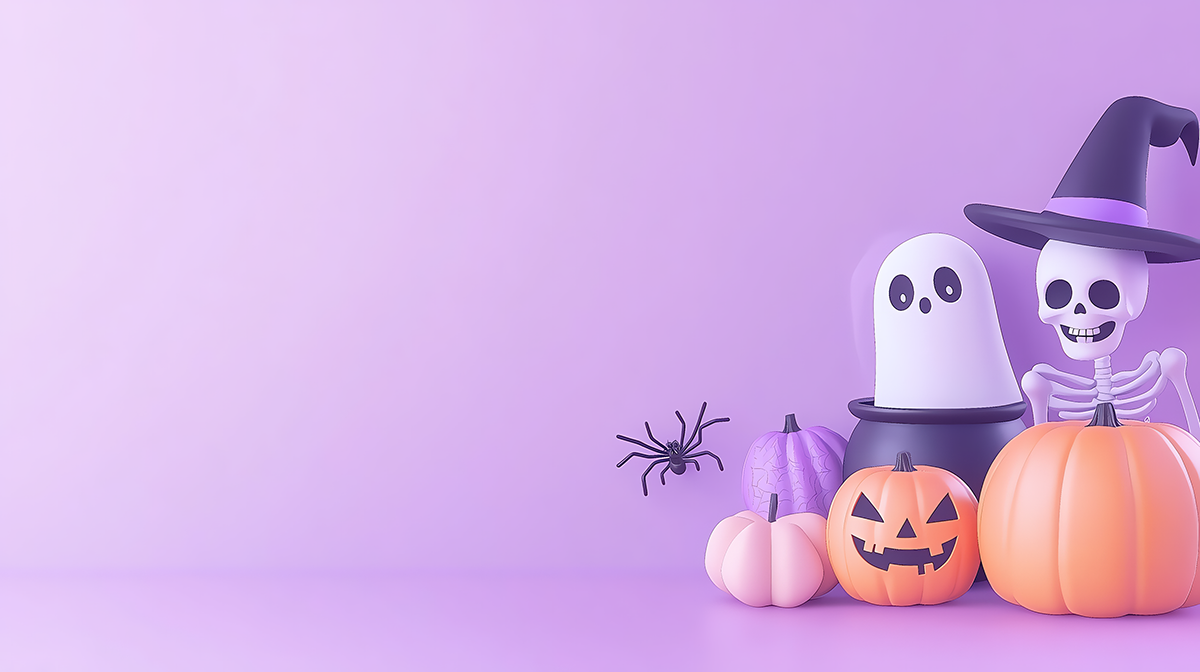 3D-рендер милых мультяшных персонажей Хэллоуина на фиолетовом фоне с пространством для текста и тыквами в минималистском стиле