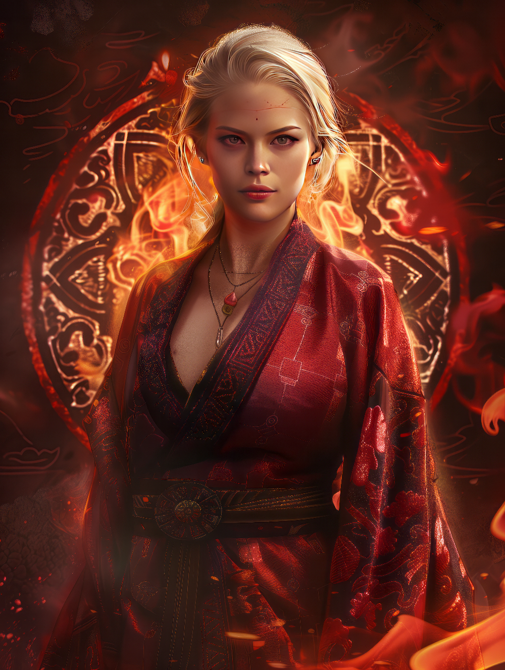 Девушка в красном на фоне огненного узора. Игра престолов. Постер