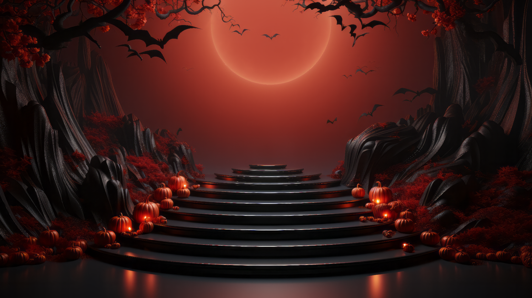 Хэллоуин фон. Лестница в азиатском стиле с тыквами, красный
