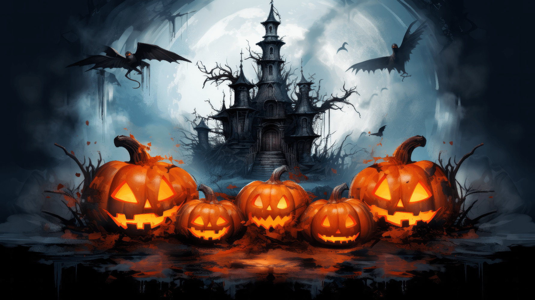 Хэллоуин фон. Старый дом в готическом стиле, тыквы на переднем плане