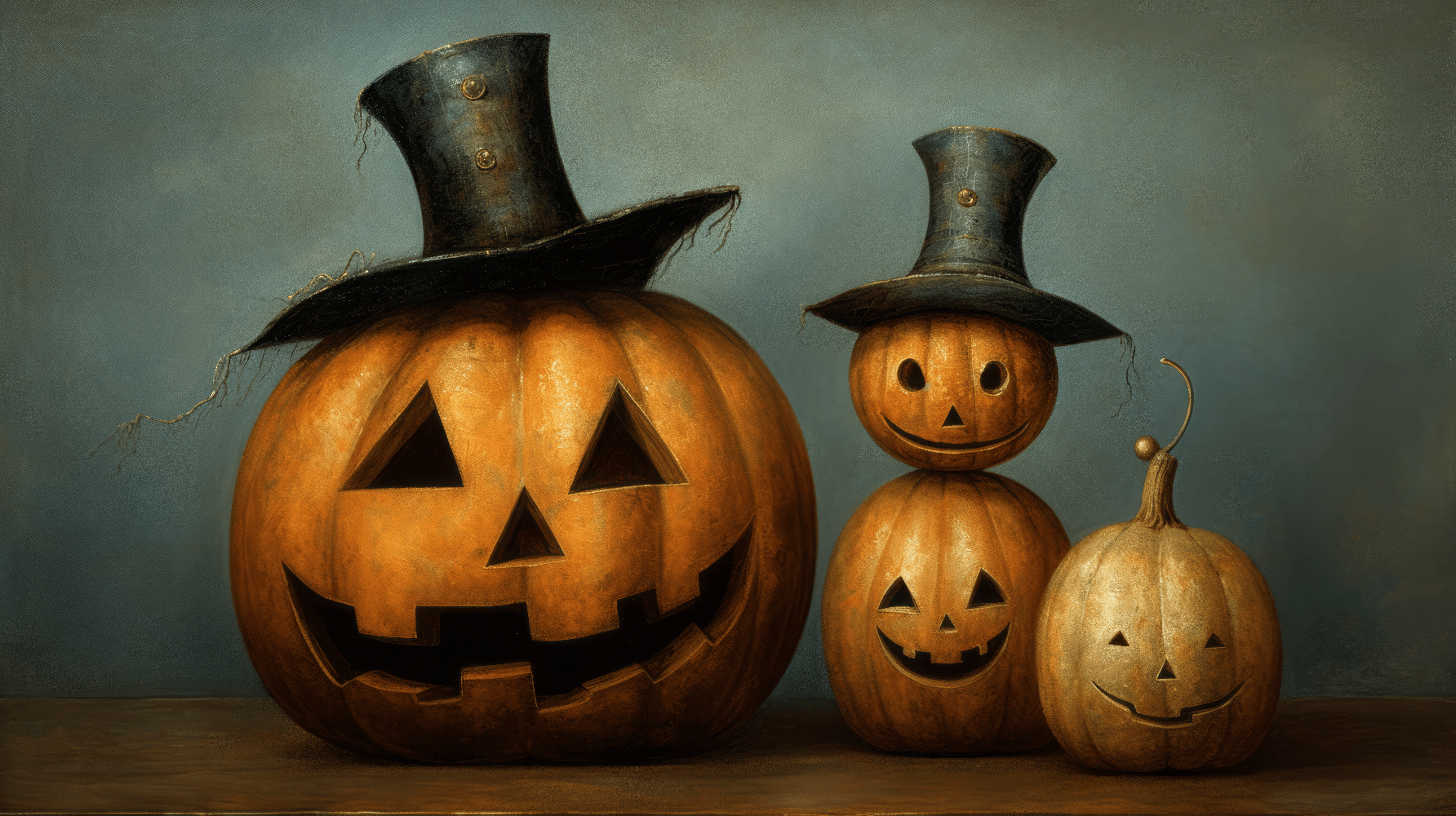Хэллоуин. Тыквы в цилиндрах, на деревянном столе