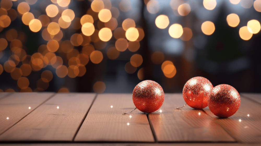 Небольшие елочные шары на деревянном столе с боке на заднем плане