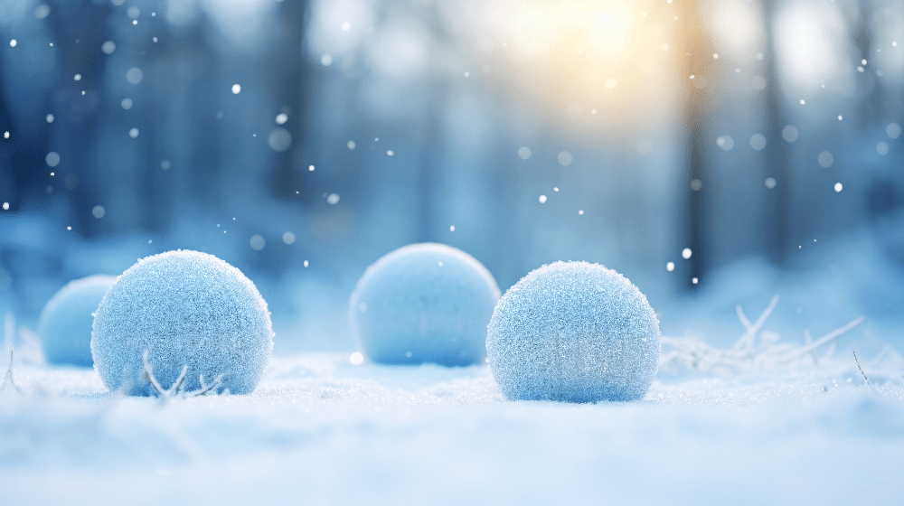 Вязаные шары на белом снегу в лесу, вокруг снежинки, создающие ощущение зимнего дня