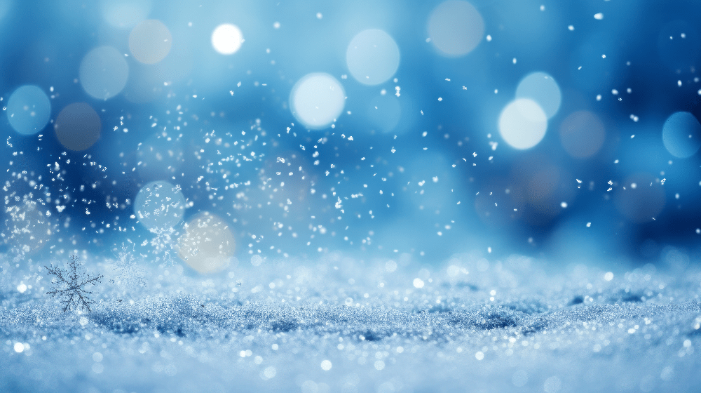 Зимний пейзаж в голубых тонах, снег и иней, боке на заднем плане