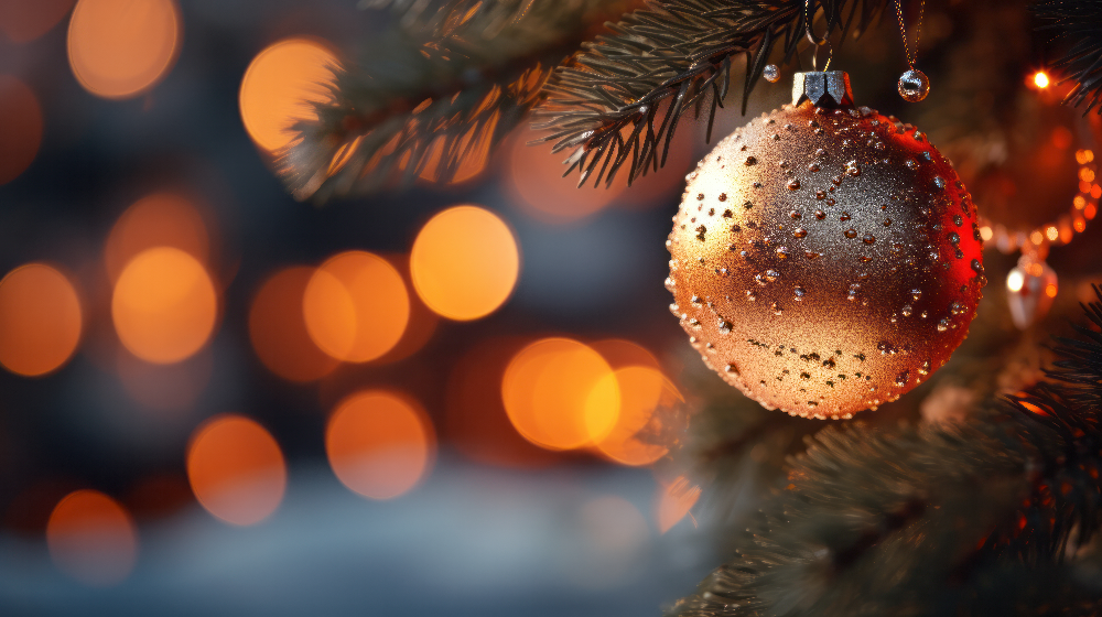 Золотой шар, висящий на елочной ветке, на размытом фоне в вечернем свете, снятые крупным планом
